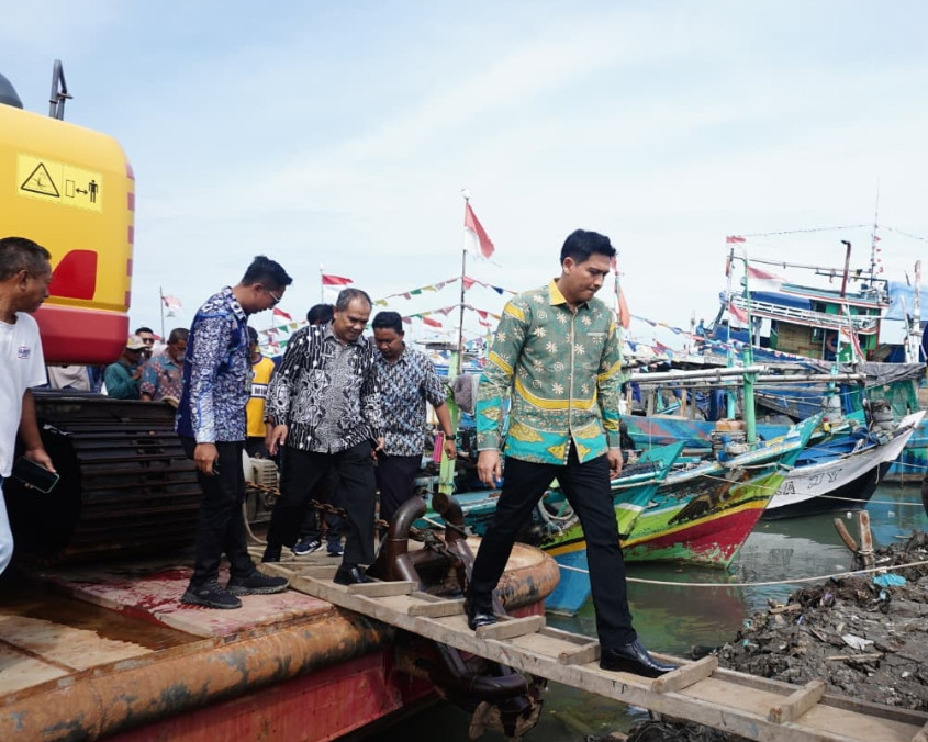 Bupati Indramayu Lucky Hakim turut hadir didampingi oleh Kepala Dinas Perikanan dan Kelautan kabupaten Indramayu, Edi Umaedi, meninjau langsung kapal keruk yang digunakan untuk normalisasi aliran sungai di kawasan perairan Pelabuhan Dadap, Kecamatan Juntinyuat pada Kamis, (23/10/2025).